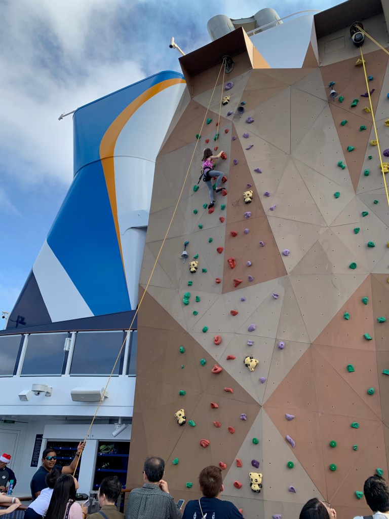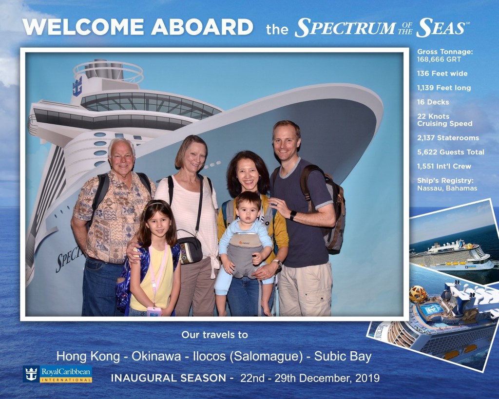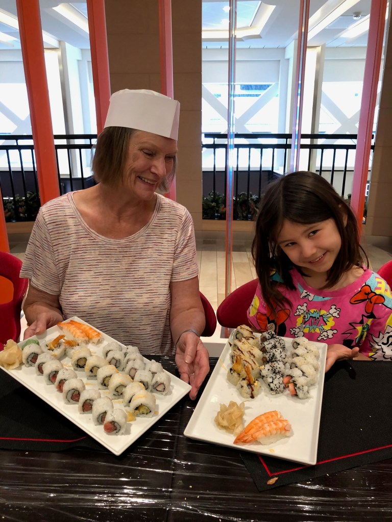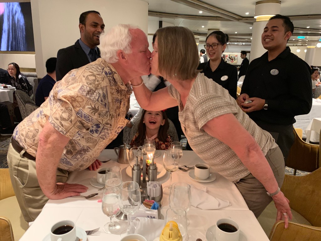 The time on the boat was fun. We went rock climbing (Naomi says it was very easy), played laser tag, bumper cars, and ate a lot of delicious food. (Timothy got spoiled and demanded cruise-quality food after we returned.) We also went on something called iFly, which is a wind tunnel that simulates sky diving. The girls made sushi. Nearly all of us got seasick on the last day because we were sailing close to a typhoon. Our waitstaff was fantastic including the robotic ones (see video below). The kissing picture was taken on Ama and Papa’s wedding anniversary – note Naomi’s excited look about them kissing.