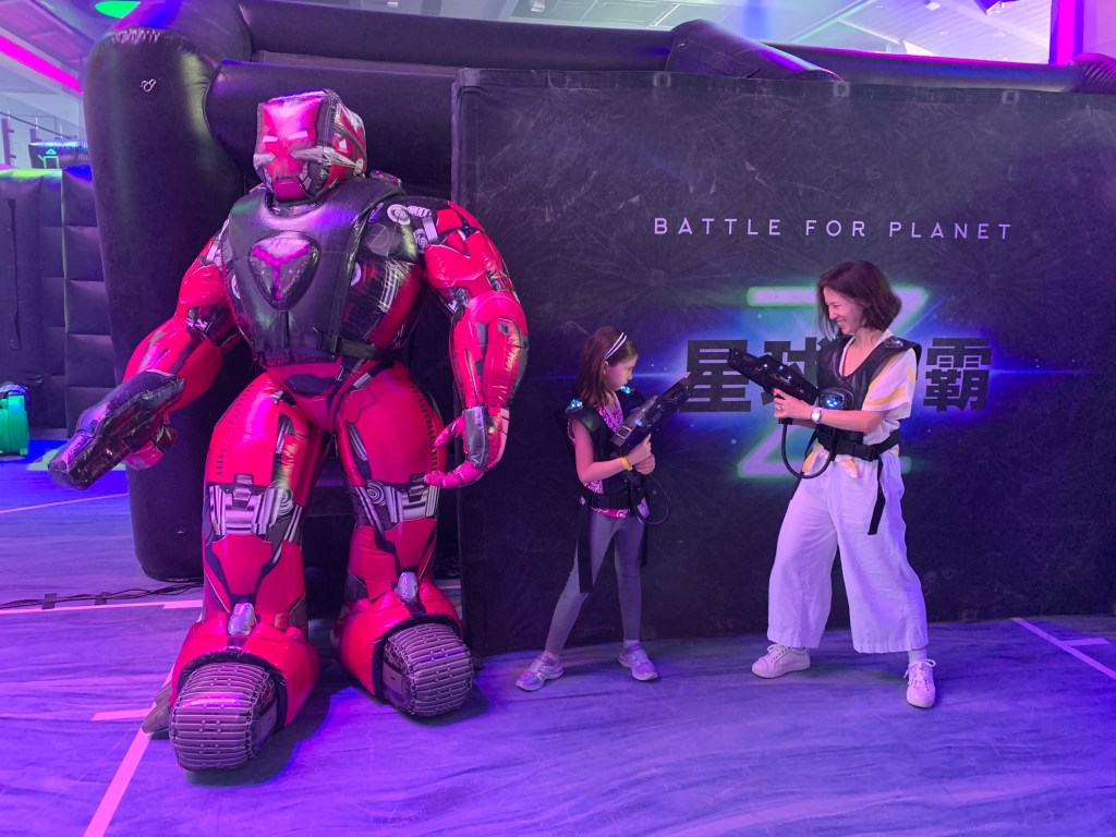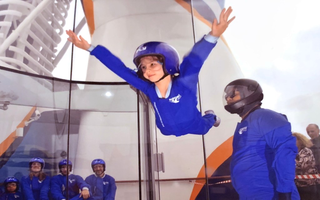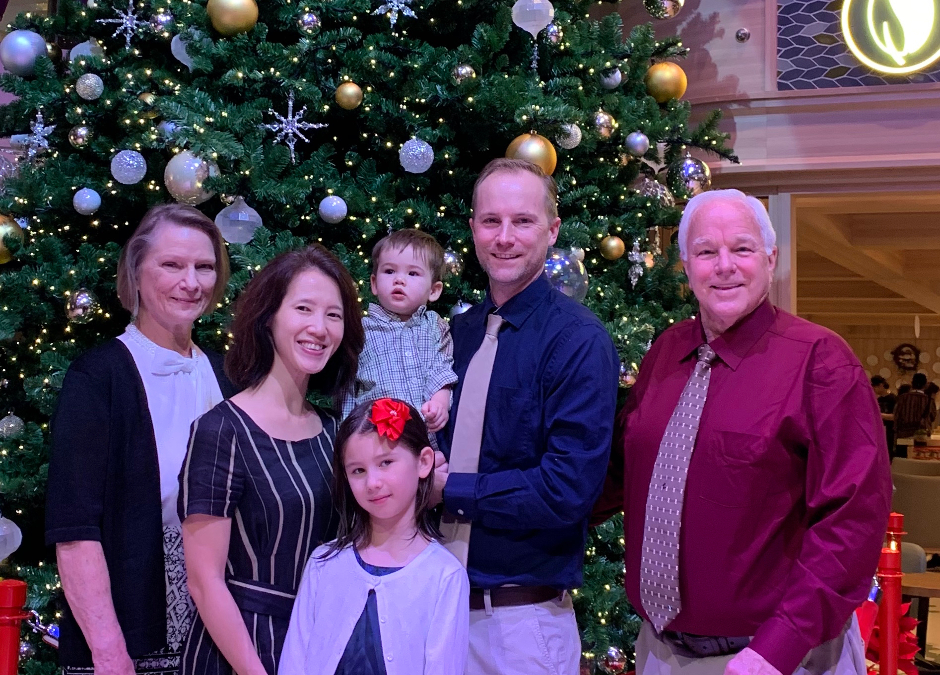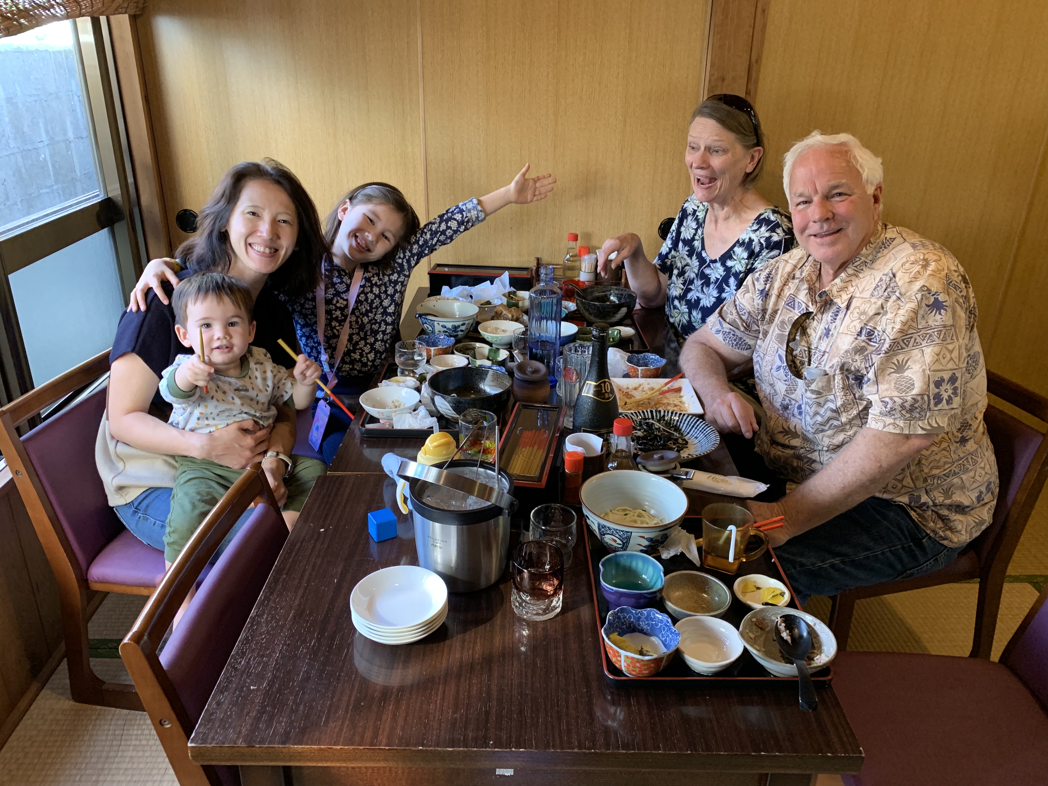 The time on the boat was fun. We went rock climbing (Naomi says it was very easy), played laser tag, bumper cars, and ate a lot of delicious food. (Timothy got spoiled and demanded cruise-quality food after we returned.) We also went on something called iFly, which is a wind tunnel that simulates sky diving. The girls made sushi. Nearly all of us got seasick on the last day because we were sailing close to a typhoon. Our waitstaff was fantastic including the robotic ones (see video below). The kissing picture was taken on Ama and Papa’s wedding anniversary – note Naomi’s excited look about them kissing.