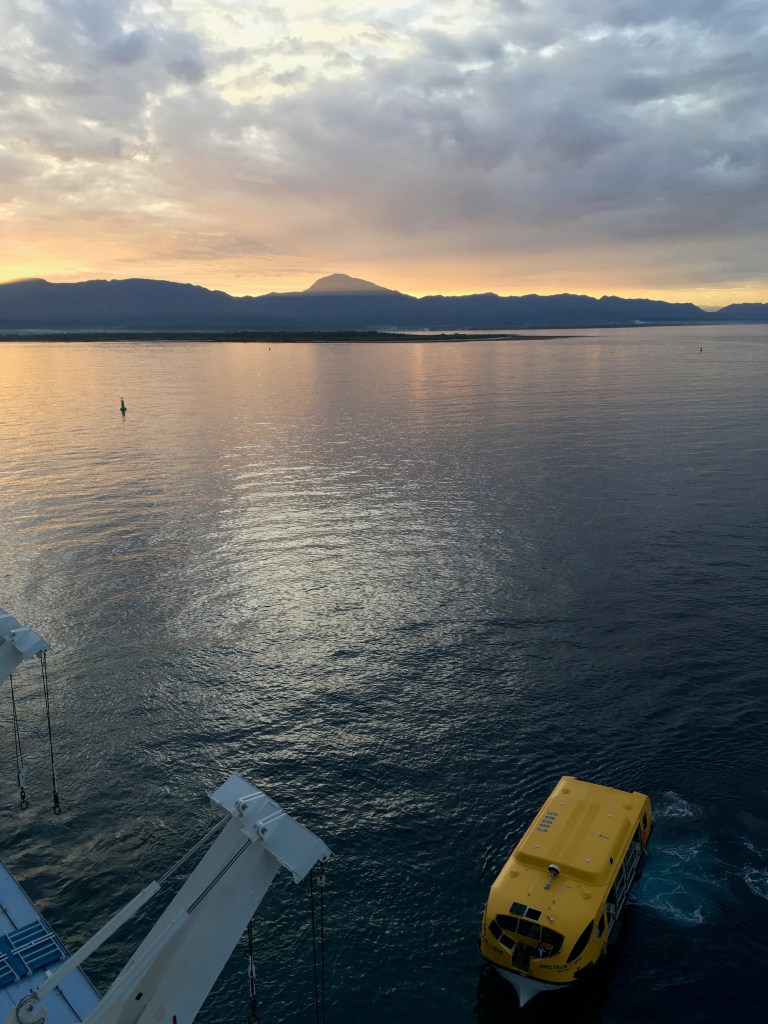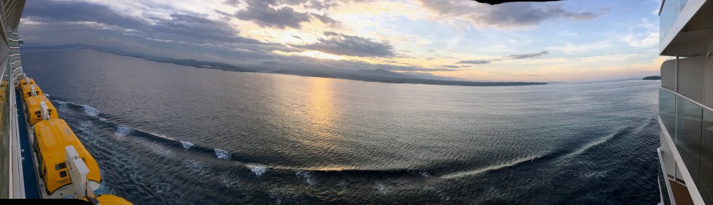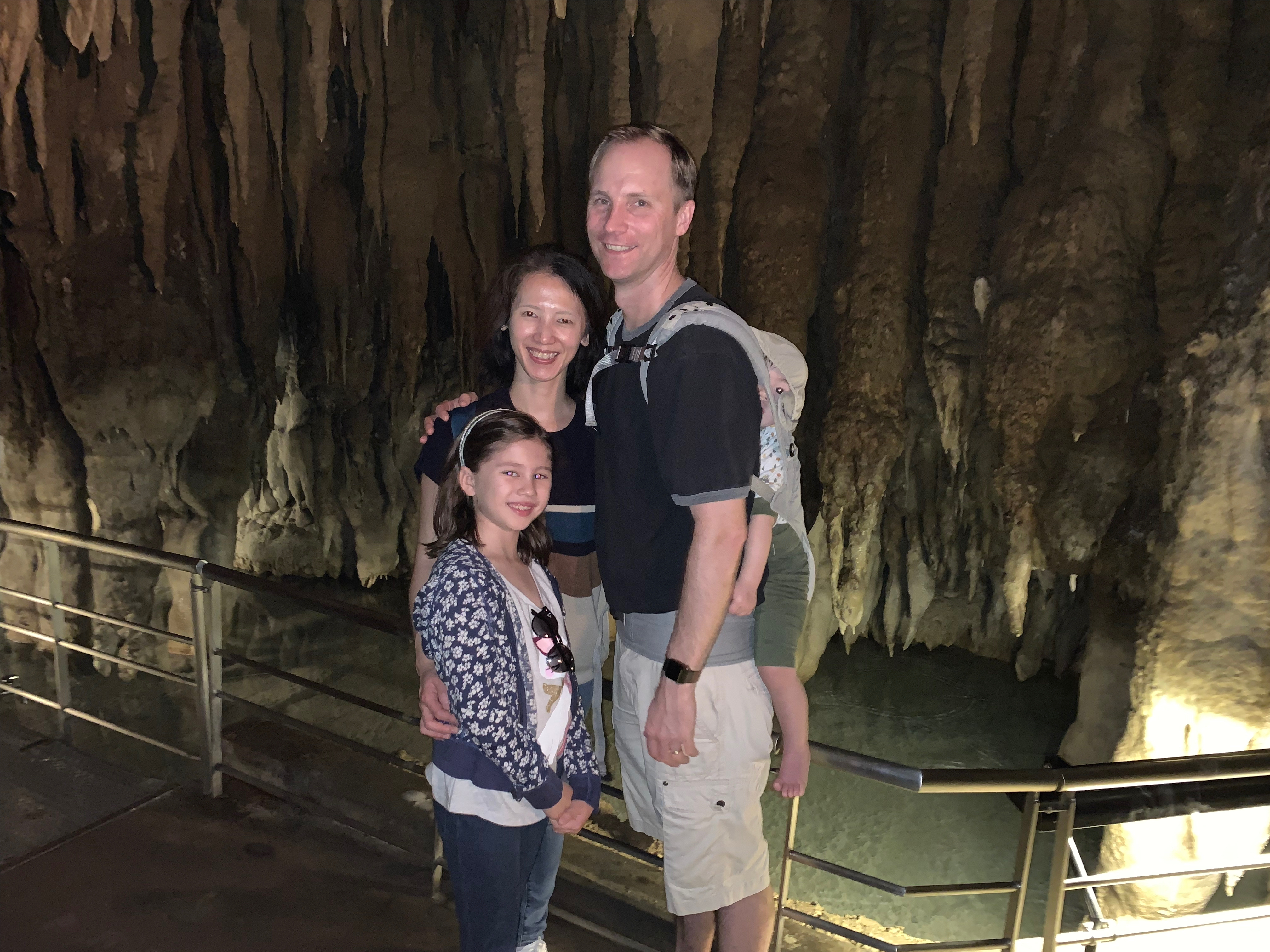 The cruise stopped at Okinawa, Japan for a day. The girls – Ama (grandma), Gigi, and Naomi – did Okinawa Coral Dyeing while the boys – Papa, Kyle, and Timothy – went to Shuri Castle, which burned down six months ago so we couldn’t see all of it. We had lunch at a delicious traditional Japanese lunch where we had to take off our shoes (and were asked to not “mistake your footwear”). We also went to an underground cave where we saw many stalactites and stalagmites (rock growing from ceiling and floor based on dripping water).