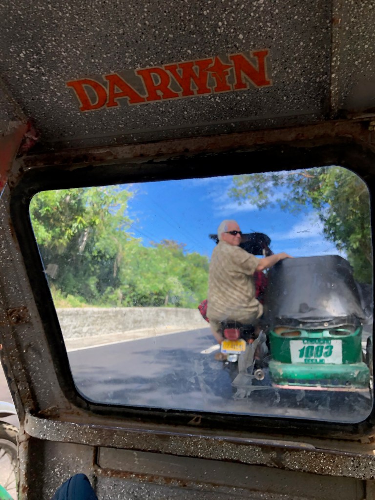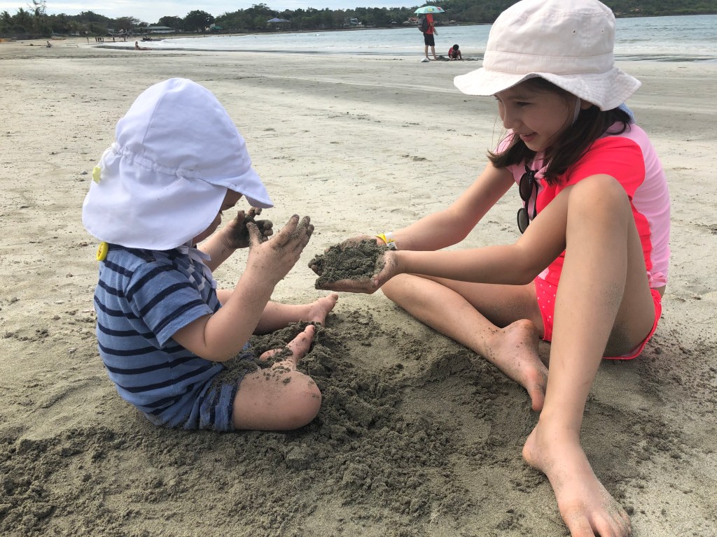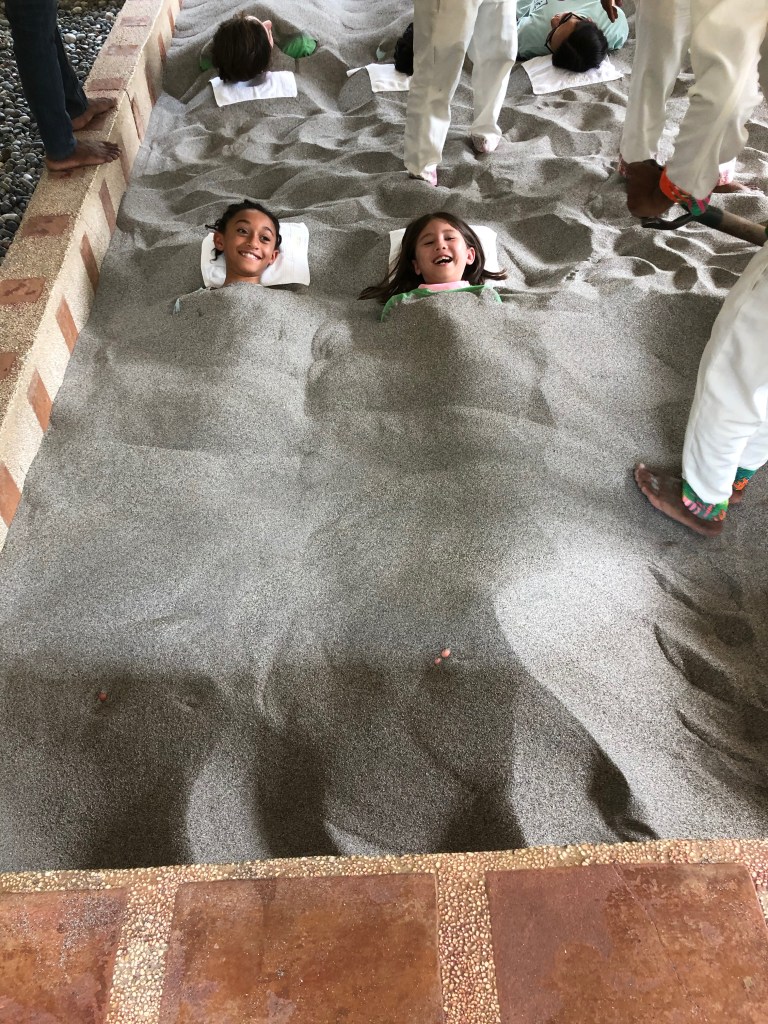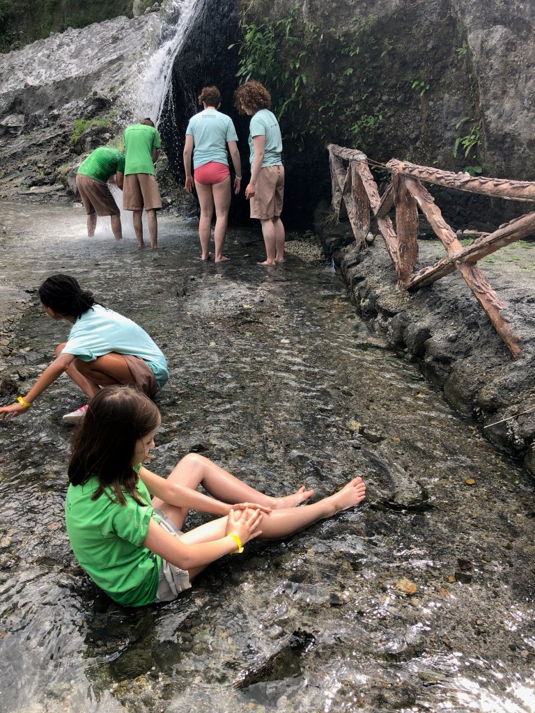 We stopped at the Philippines for two days. Upon arrival, we were greeted by a nice song played on the marimbas (see video). On the first day, we went to a beach. We got there by riding on rickshaws, but these were really motorcycles with a small sitting area connected. Timothy was fascinated by the wind on the ride (see video). Naomi wants to make sure we say that we had chips for lunch that day. On the second day, Naomi and Gigi went to a hot spring where they swam and were buried in warm volcano sand. To get there, they had a very bumpy (and fun) ride in jeeps that went offroad and through rivers.